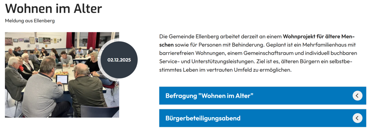 Die Gemeinde Ellenberg plant ein Wohnprojekt für Seniorinnen und Senioren in der Ortsmitte. Ziel ist es, älteren Menschen ein bedarfsgerechtes, wohnortnahes Wohnen zu ermöglichen und gleichzeitig die Ortsmitte nachhaltig zu beleben. Doch was wünschen sich die Einwohnerinnen und Einwohner? Was ist diesen wichtig?