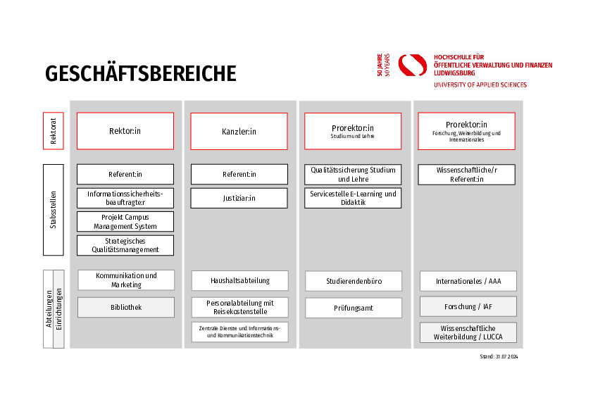 Die Rektorin vertritt die Hochschule nach außen. Die Prorektorin und der Prorektor sind zuständig für die Aufgabenbereiche Studium und Lehre einerseits und für Forschung, Weiterbildung und Internationales andererseits. Der Kanzler ist für die Wirtschaft- und Personalverwaltung zuständig und zugleich Beauftragter für den Haushalt.