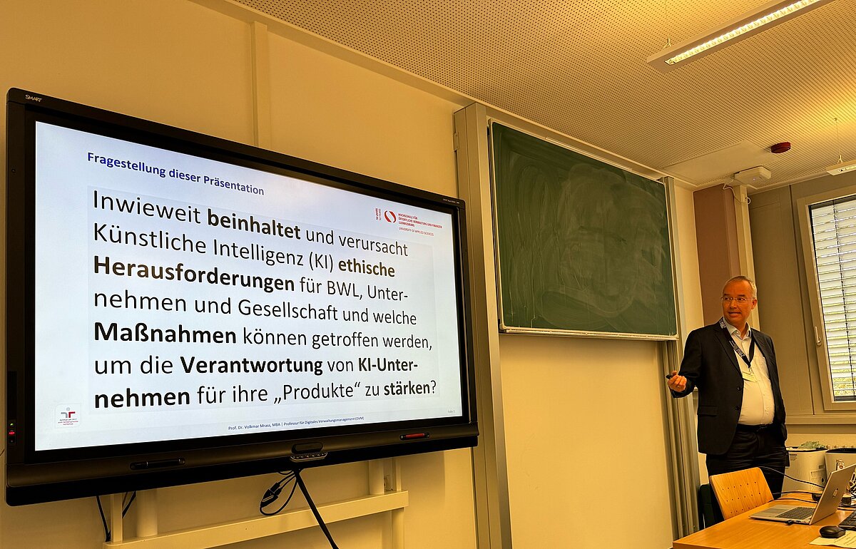 Der Vortrag von Prof. Dr. Volkmar Mrass auf dieser Traditions-Konferenz stand unter dem Titel „ChatGPT & KI: Ethische Herausforderungen für BWL, Unternehmen und Gesellschaft“ und fand auf einer Session der Wissenschaftlichen Kommission „Wissenschaftstheorie und Ethik in der Wirtschaftswissenschaft“ statt. Er beschäftigte sich mit der Frage, inwieweit Künstliche Intelligenz (KI) ethische Herausforderungen für BWL, Unternehmen und Gesellschaft beinhaltet und welche Maßnahmen getroffen werden müssen, um diesen zu begegnen und Verantwortlichkeiten zu stärken.