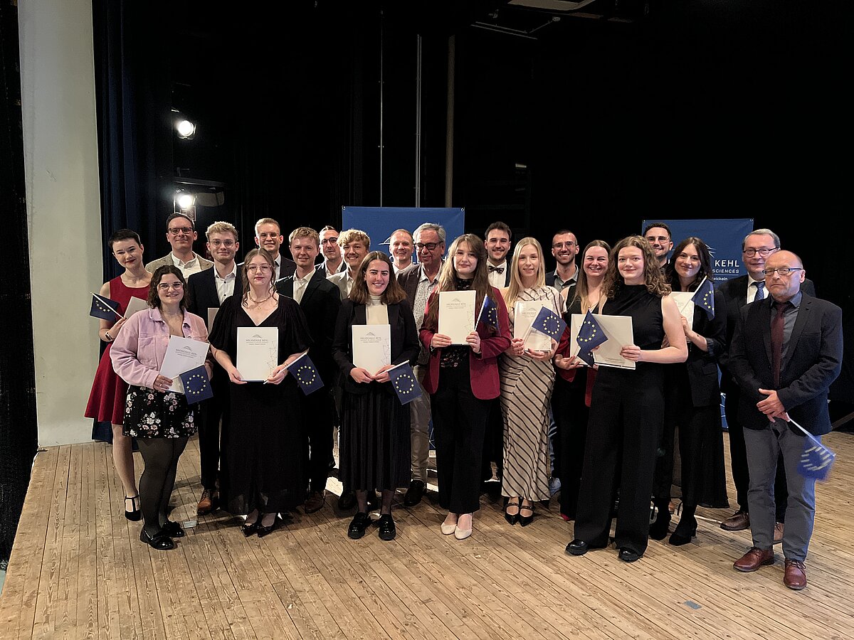 „Dass Sie an das Projekt ‚Europa‘ glauben, haben Sie nun mit dem Abschluss dieses anspruchsvollen Masterstudiengangs gezeigt. Sie sind es, die nun in der Praxis Europa voranbringen werden“, so Prof. Dr. Joachim Beck, Rektor der Hochschule Kehl, bei seiner Begrüßung der anwesenden Gäste. Auch die Hochschule Ludwigsburg, vertreten durch Prof. Dr. Jörg Dürrschmidt, richtete an diesem feierlichen Abend das Wort an die Absolvent*innen: „Ich wünsche Ihnen allen viel Mut bei der Bewältigung Ihrer künftigen beruflichen Aufgaben. Danke, dass Sie sich für Europa starkmachen werden.“