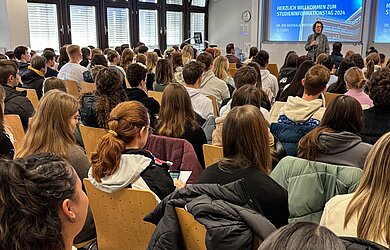 Gefüllter Hörsaal am Studieninfotag der HVF Ludwigsburg, Studieniteressierte hören den Vorträgen zu.© HVF © HVF